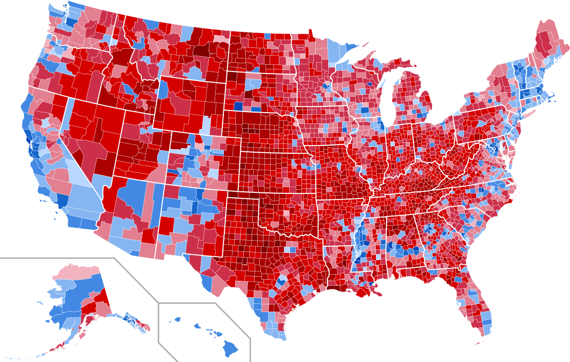 In contrast to the fairly clean geographical and population divide of 1861, pro- and anti-Trump Americans in 2020 were dispersed in varying concentrations in each state, as the map below demonstrates via voting outcomes at the county level: