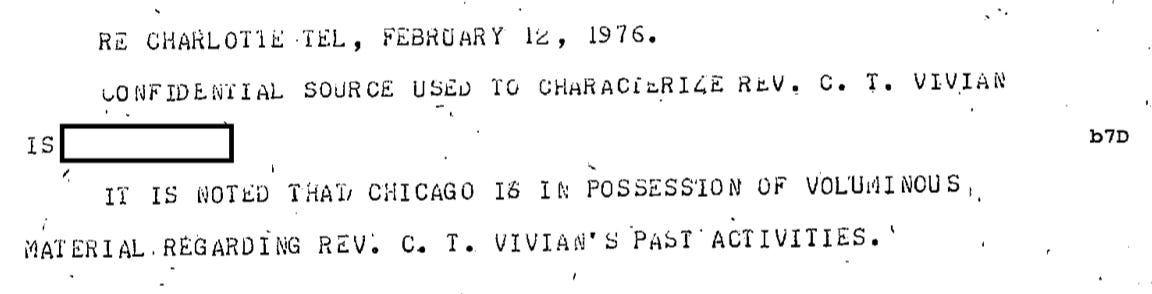 The same report noted Vivian's past organization leadership positions, and stated that, "...Chicago is in possession of voluminous material regarding Rev. C.T. Vivian's past activities."