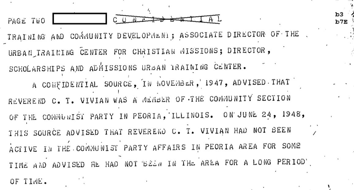 As it did with virtually every other Black civil rights leader, the Bureau trafficked in unverified confidential source allegations that Vivian had been a Communist Party-USA member as early as 1947, according to a Chicago FBI Field Office report from February 13, 1976: